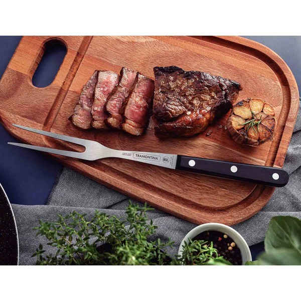 Die Tramontina CENTURY Tranchiergabel ist der perfekte Begleiter zum Tranchiermesser – ob beim BBQ, am Festtagstisch oder beim stilvollen Servieren von Braten. Mit ihren zwei robusten Zinken aus rostfreiem Edelstahl hält sie Fleisch, Geflügel oder Grillgut zuverlässig in Position – für präzises und sicheres Schneiden direkt am Tisch oder Schneidebrett.
