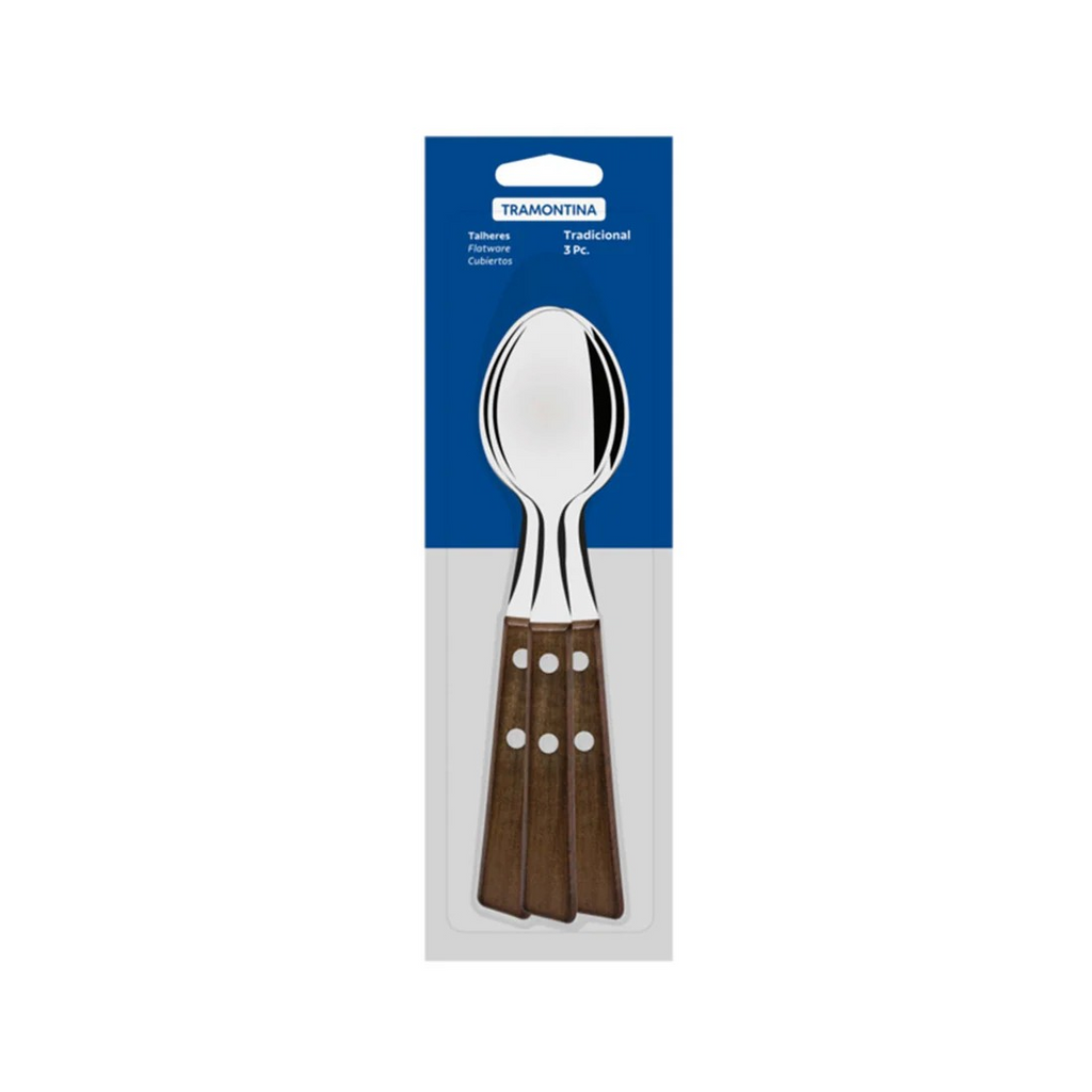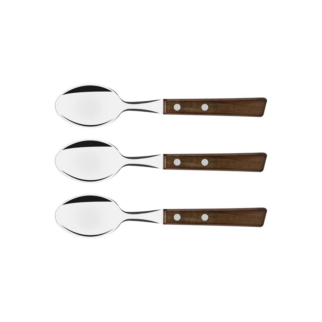Mit dem 3-teiligen Tafellöffel-Set der Serie TRADICIONAL bringst du rustikales Flair auf den gedeckten Tisch. Die Löffel sind aus hochwertigem, rostfreiem Edelstahl gefertigt und mit ergonomischen Griffen aus Naturholz versehen – ideal für gesellige Runden mit Familie oder Freunden.